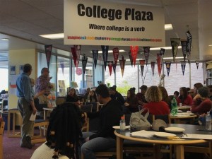 Every Thursday during the fall and spring terms, two or three current students volunteer in in the college counseling center, called The College Plaza, at Santa Fe High. Last Thursday was the launch of the Junior Jump Start program. All high school juniors were invited to attend this lunchtime meeting. To sweeten the deal, pizza and cookies were provided for everyone! The St. John’s students introduced themselves and helped ask some ice breaker questions to loosen everyone up and bring anxiety levels down. Then there was a short presentation explaining the series of activities and events that will take place to help juniors start college search process.
