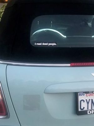 Lastly, I couldn’t help but stop and take a picture of this woman’s awesome bumper stickers!!!! Book babes unite! I read dead people! I would love to find these on a t-shirt or tote bag. Let me know what things speak to you!