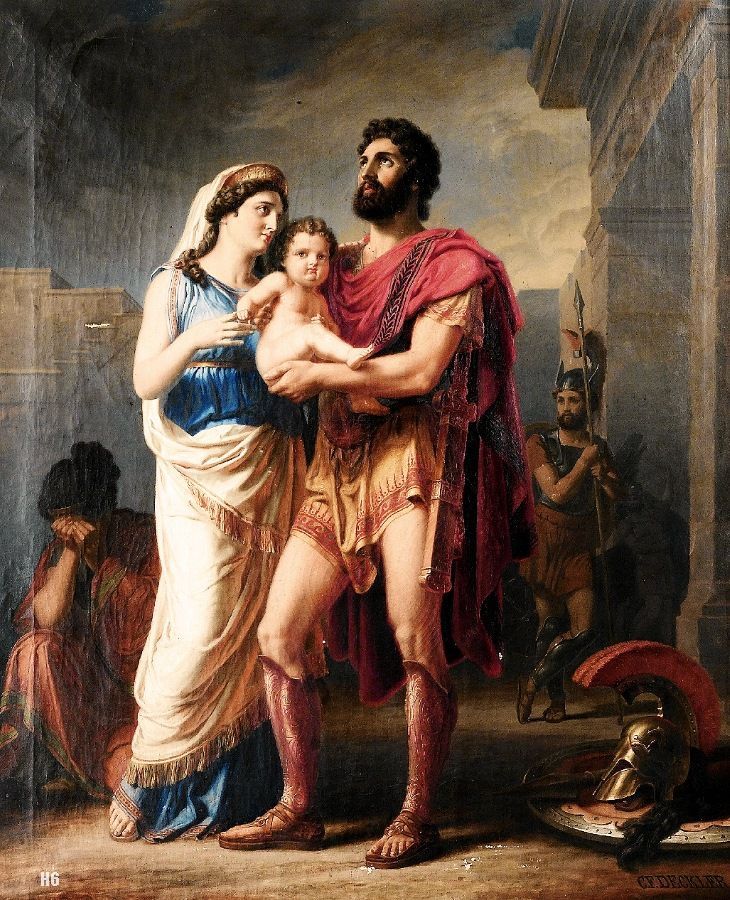 (Hector) stretched his arms towards his child, but the boy cried and nestled in his nurse’s bosom, scared at the sight of his father’s armour, and at the horse-hair plume that nodded fiercely from his helmet. His father and mother laughed to see him, but Hector took the helmet from his head and laid it all gleaming upon the ground. Then he took his darling child, kissed him, and dandled him in his arms, praying over him the while to Jove and to all the gods. “Jove,” he cried, “grant that this my child may be even as myself, chief among the Trojans; let him be not less excellent in strength, and let him rule Ilius with his might. Then may one say of him as he comes from battle, ‘The son is far better than the father.’ May he bring back the blood-stained spoils of him whom he has laid low, and let his mother’s heart be glad.'”